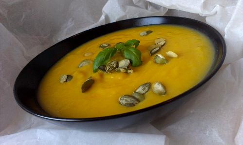 Gorącą zupę podajemy w miseczkach. Dekorujemy pestkami dyni oraz listkami bazylii lub natką pietruszki.
